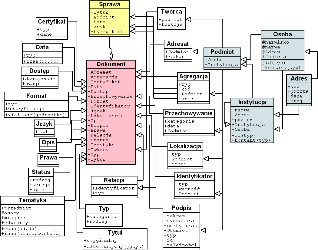Diagram uwidacznia także, że sprawa jest agregacją dokumentów. Nalezy pamiętać że taką agregacją niekoniecznie musi być sprawa. Może to być ... dowolna agregacja. Dla uproszczenia diagram nie pokazuje wszystkich zależności pomiędzy elementami metadanych i sprawą, ale wymienione w sprawie elementy metadanych są takimi samymi elementami jak te dla dokumentu: